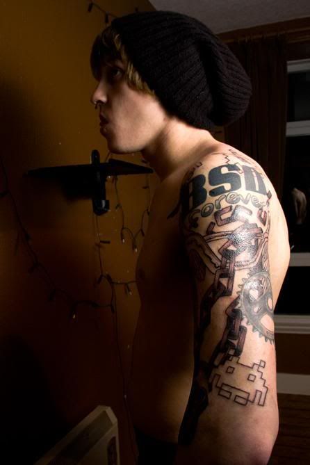 Si spent 3 hours in the chair yesterday extending his BMX sponsors sleeve. BSD bars accompany their sprocket and 20Twenty space invaders mingling about too.